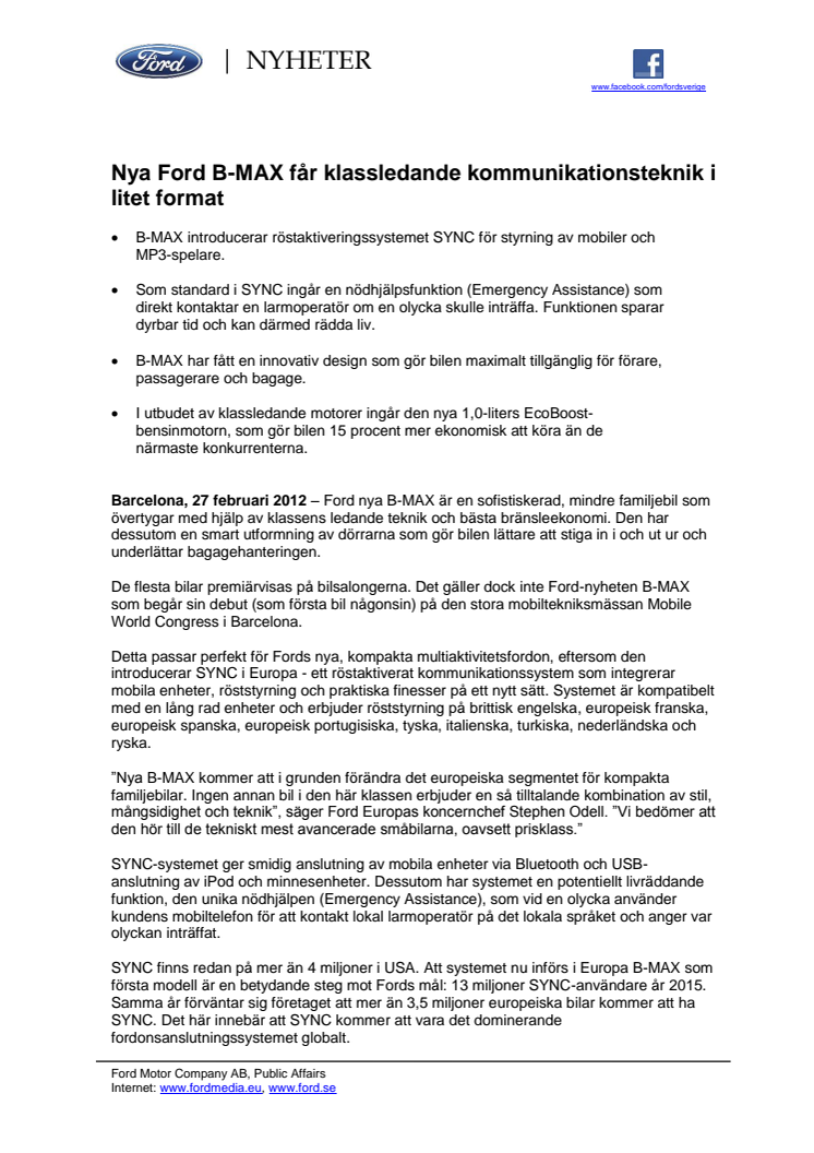 SYNC finns redan på mer än 4 miljoner i USA. Att systemet nu införs i Europa B-MAX som första modell är en betydande steg mot Fords mål: 13 miljoner SYNC-användare år 2015. Samma år förväntar sig företaget att mer än 3,5 miljoner europeiska bilar kommer att ha SYNC. Det här innebär att SYNC kommer att vara det dominerande fordonsanslutningssystemet globalt.