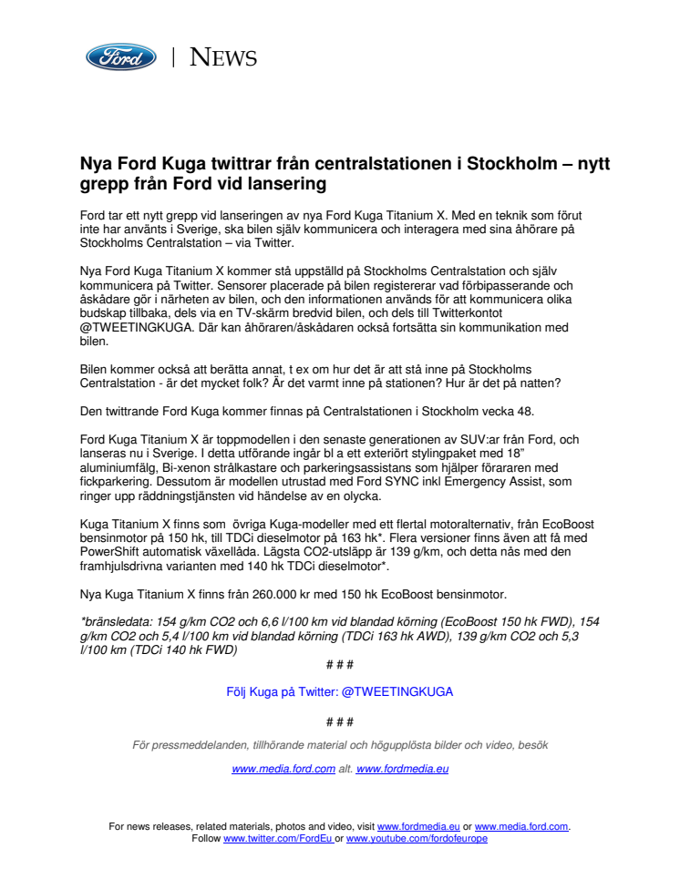 Ford tar ett nytt grepp vid lanseringen av nya Ford Kuga Titanium X. Med en teknik som förut inte har använts i Sverige, ska bilen själv kommunicera och interagera med sina åhörare på Stockholms Centralstation – via Twitter.