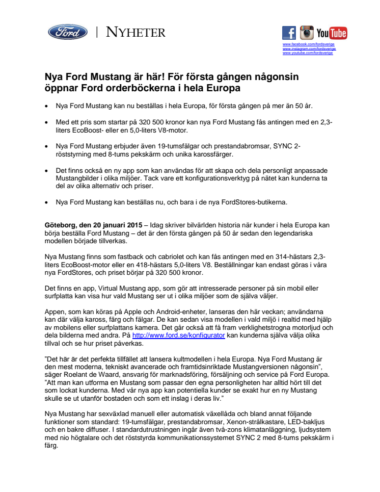 Göteborg, den 20 januari 2015 – Idag skriver bilvärlden historia när kunder i hela Europa kan börja beställa Ford Mustang – det är den första gången på 50 år sedan den legendariska modellen började tillverkas.