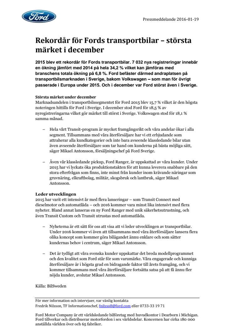 Fredrik Nilsson, TF Informationschef, fnilsso8@ford.com eller 0733-331971