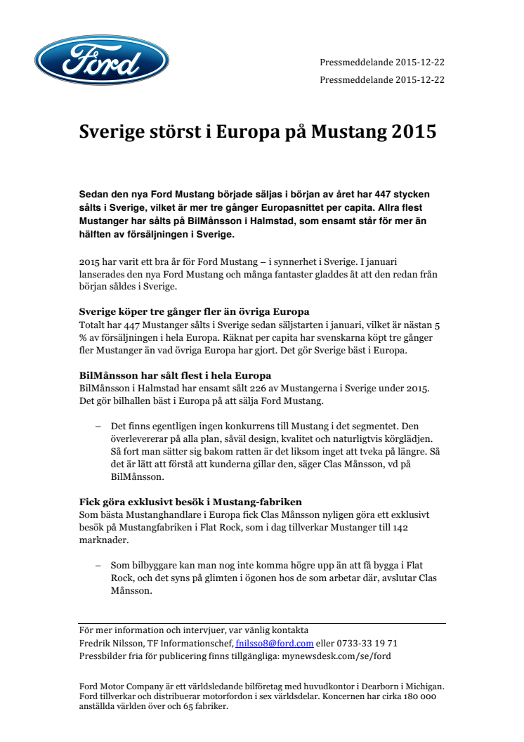 Sedan den nya Ford Mustang började säljas i början av året har 447 stycken sålts i Sverige, vilket är mer än tre gånger Europasnittet per capita. Allra flest Mustanger har sålts på BilMånsson i Halmstad, som ensamt står för mer än hälften av försäljningen i Sverige.