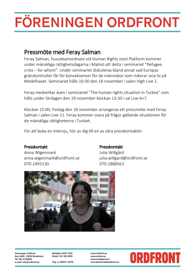 Feray Salman, huvudsamordnare vid Human Rights Joint Platform kommer under mänskliga rättighetsdagarna i Malmö att delta i seminariet ”Refugee crisis – for whom”. Under seminariet diskuteras bland annat vad Europas gränskontroller får för konsekvenser för de människor som riskerar sina liv på Medelhavet. Klockan 15:00, fredag den 18 november arrangeras ett pressmöte med Feray Salman i salen