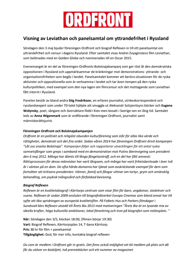 Stig Fredrikson till panelsamtal om yttrandefrihet i Ryssland & visning av Leviathan