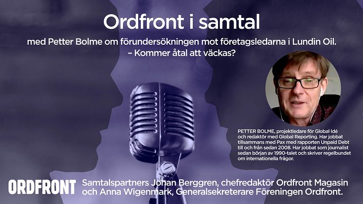 I detta samtal, som är del av Ordfronts samtalsserie Ordfront samtalar pratar vi om den kommande rättegången mot Lundin Oils företrädare. Kommer åtal att väckas? Johan Berggren, chefredaktör på Ordfront magasin och Anna Wigenmark, generalsekreterare på Föreningen Ordfront, i samtal med Petter Bolme, projektledare för Global Idé och redaktör med Global Reporting. Petter Bolme har jobbat tillsammans med Pax med rapporten Unpaid Debt till och från sedan 2008. Har jobbat som journalist sedan början av 1990-talet och skriver regelbundet om internationella frågor.
