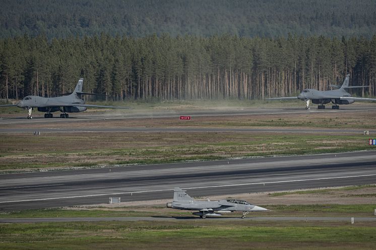 20230619 F21 LULEÅ SVERIGE AMERIKANSKA B-1B LANCER LANDADE PÅ F 21 EFTER ATT BLIVIT ESKORTERADE AV JAS-39 GRIPEN. FOTO: AXEL ÖBERG/FÖRSVARSMAKTEN