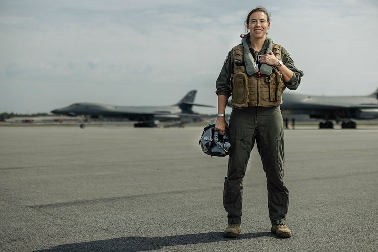 20230619 F21 LULEÅ SVERIGE AMERIKANSKA B-1B LANCER LANDADE PÅ F 21 EFTER ATT BLIVIT ESKORTERADE AV JAS-39 GRIPEN. Denna bild: Kapten Simone Durham, 9th Bomb Squadron, US Air Force " Det är ett utmärkt tillfälle för oss att öva att komunicera med våra alierade på marken" FOTO: AXEL ÖBERG/FÖRSVARSMAKTEN
