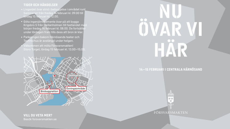 Försvarsmakten övar för att kunna försvara Härnösand om det i framtiden skulle behövas. Under slutet på veckan övar flera av Försvarsmaktens förband i och i närheten av Härnösand. Övningarna kommer att genomföras under hela vecka 7 (10 - 16 februari) och en bit in i vecka 8 med särskild närvaro på följande platser: