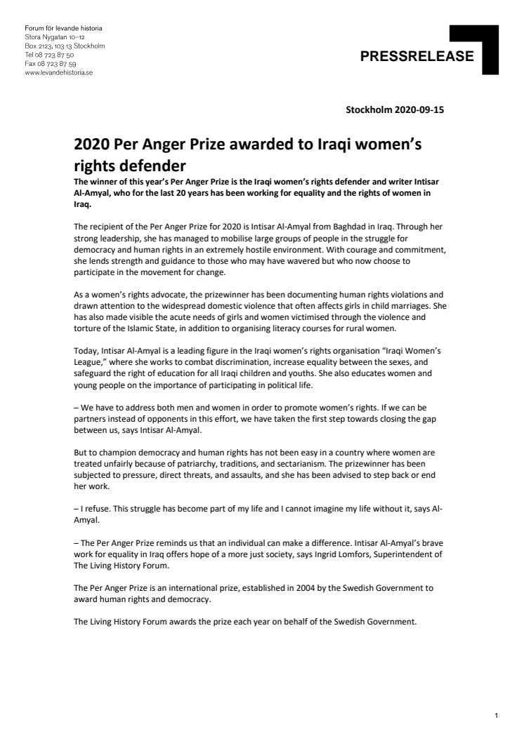 Årets Per Anger-pris tilldelas den irakiska kvinnorättsförsvararen och skribenten Intisar Al-Amyal som sedan 20 år tillbaka arbetar för kvinnors rättigheter och jämställdhet i Irak.