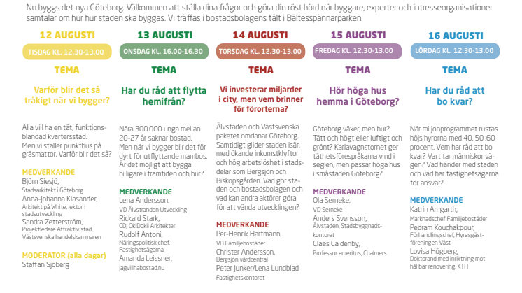 Alla arrangemang under veckan är naturligtvis helt gratis för besökarna och alla är varmt välkomna att ta del av diskussionerna kring en av Göteborgs viktigaste framtidsfrågor.