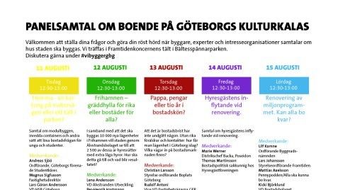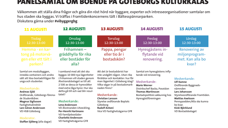 Tisdag till lördag kl. 12:30-13:00 kan den som är intresserad av bostadsfrågor komma till vårt tält för att lyssna på panelsamtal där byggare, experter och intresseorganisationer tillsammans med representanter från bostadsbolagen diskuterar aktuella ämnen såsom modulbyggen, bostadsbrist och renovering. För fullständigt schema, se pdf.