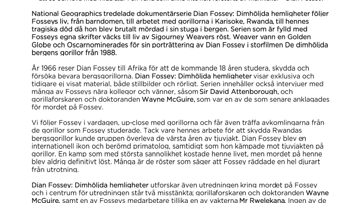 Dian Fossey: Dimhöljda hemligheter har premiär på National Geographic lördag den 2 december kl 21.00. Efterföljande avsnitt visas lördag den 9/12 och söndag den 16/12 kl 21.00.