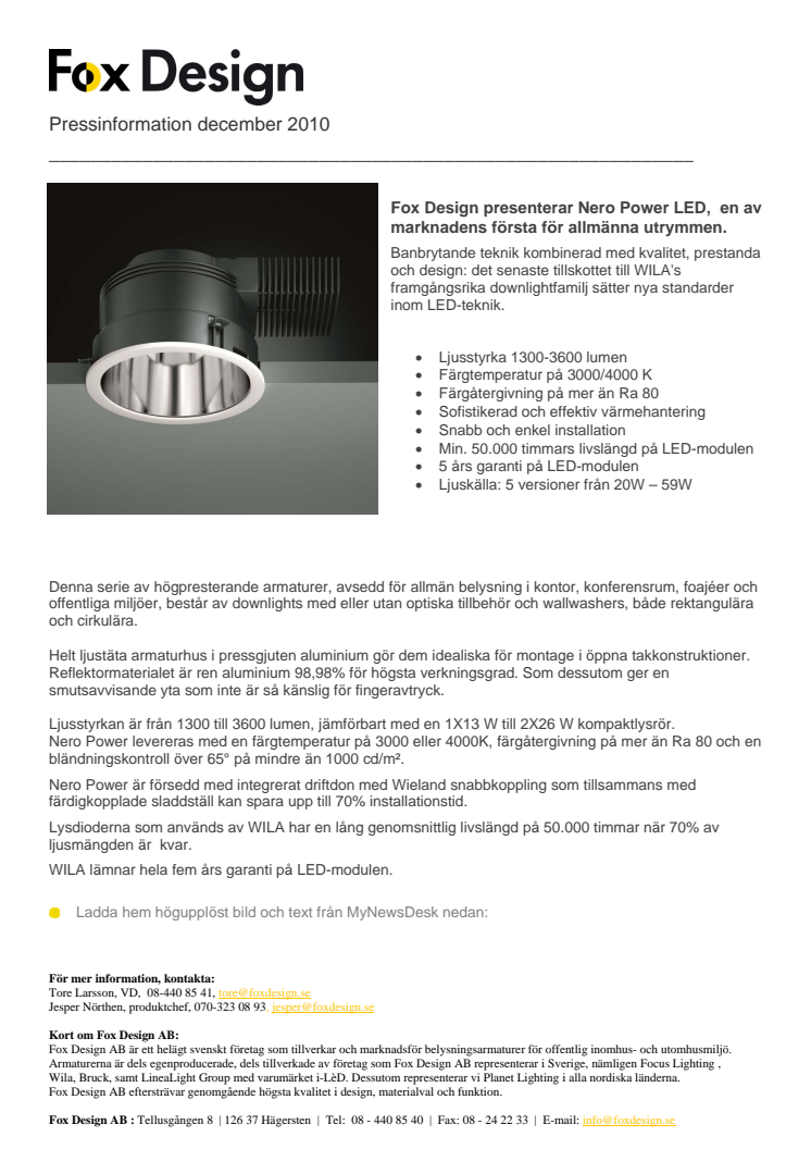 Fox Design presenterar Nero Power LED, marknadens första downlight för allmänna utrymmen.