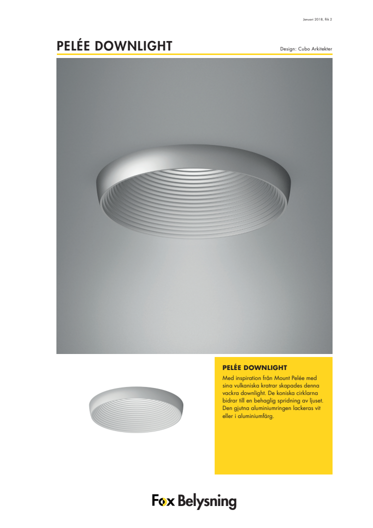 Pelée Downlight har en diamater på 160mm och de invändiga koniska rillorna understryker släktskapet mellan övriga armaturer i serien. Detta ger en tydlig design och ett behagligt ljus.