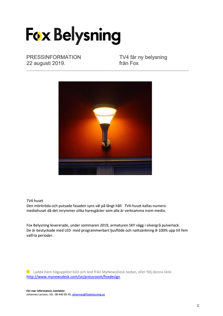 Fox Belysning levererade, under sommaren 2019, armaturen SKY vägg i silvergrå pulverlack.