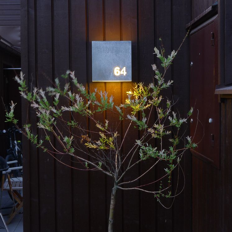 Armaturen Square i galvaniserat utförande., både med och utan urfrästa husnummer. Square tillverkas för kompaktlysrör eller LED.