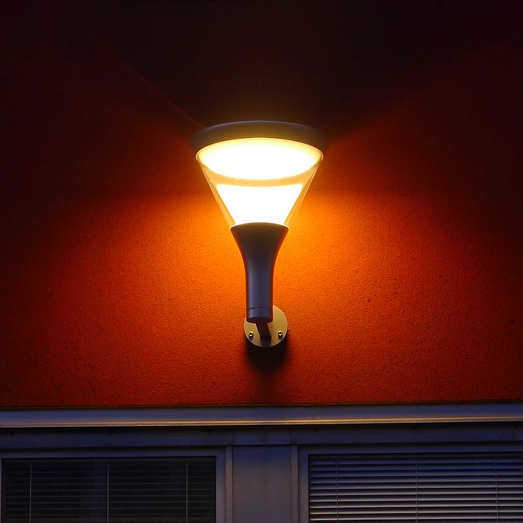 Fox Belysning levererade, under sommaren 2019, armaturen SKY vägg i silvergrå pulverlack.