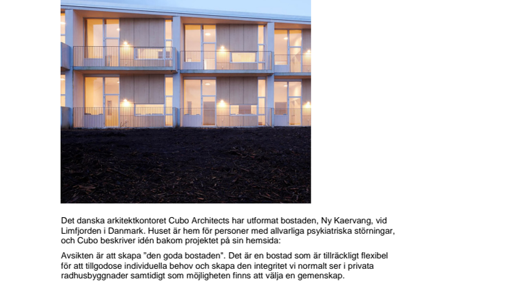Det danska arkitektkontoret Cubo Architects har utformat bostaden, Ny Kaervang, vid Limfjorden i Danmark. Huset är hem för personer med allvarliga psykiatriska störningar, och Cubo beskriver idén bakom projektet på sin hemsida: