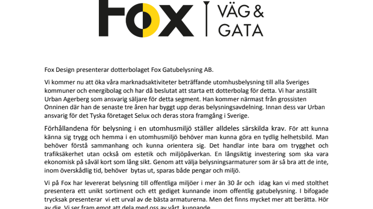 Fox Design presenterar dotterbolaget Fox Gatubelysning AB.