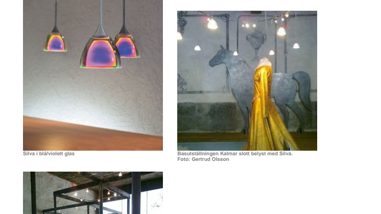 • Silva, en glasarmatur som pendel, tak eller spotlight. Glaset kan vara genomfärgat eller som i denna leverans dikroid. De dekroida glasen går att få i både röd/gul eller blå/violett nyans.