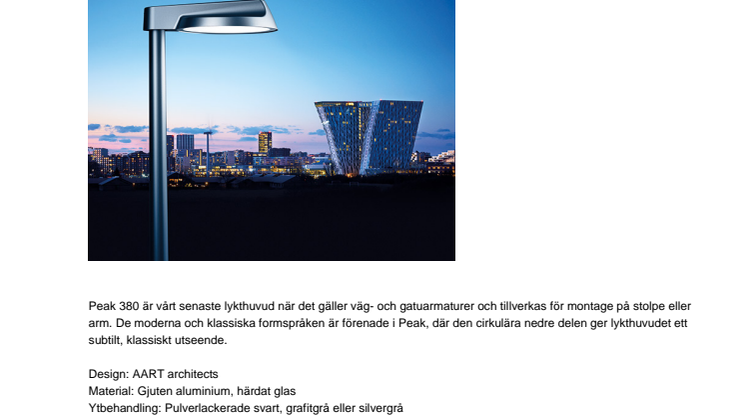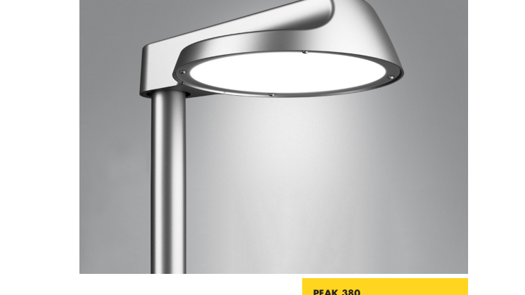 Peak 380 är vårt senaste lykthuvud när det gäller väg- och gatuarmaturer och tillverkas för montage på stolpe eller arm. De moderna och klassiska formspråken är förenade i Peak, där den cirkulära nedre delen ger lykthuvudet ett subtilt, klassiskt utseende.