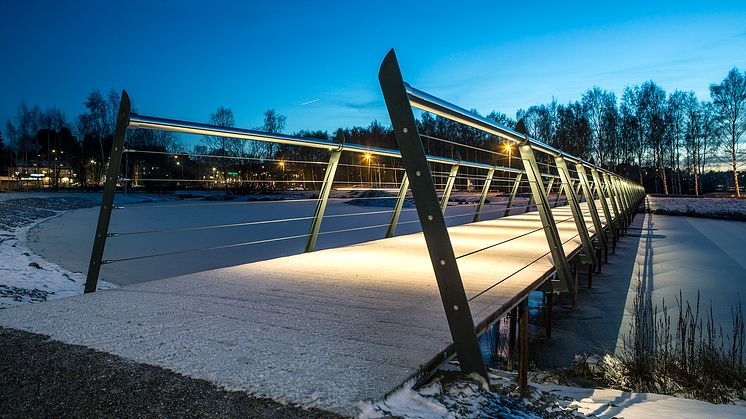 Bro över dagvattenanläggning i Barkarbystaden. Här har Black Ljusdesign skapat ett mycket spännande ljus på bron med 64st rostfria HLS LED-puckar på 1,5W. Total effekt för att få ljus på hela bron är ca 110W.