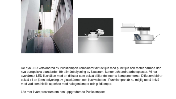 De nya LED-versionerna av Punktlampan kombinerar diffust ljus med punktljus och möter därmed den nya europeiska standarden för allmänbelysning av klassrum, kontor och andra arbetsplatser. Vi har avskärmat LED-ljuskällan med en diffusor som också döljer de interna komponenterna. Diffusorn bidrar också till en jämn belysning av glasskärmen och ljuskvaliteten i Punktlampan är nu möjlig att få i nivå med vad som hittills uppnåtts med halogenlampor och glödlampor.