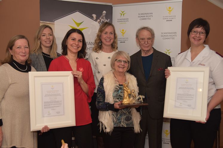 Bilden visar medlemmar ur människorättskommittén med ordförande Ruth Nordström i mitten, pristagarna Kremena Hultby och Carolina Nilsson, verksamhetsansvariga för Frälsningsarméns skyddade boenden samt Elise Lindqvist, "ängeln på Malmskillnadsgatan" längst fram.