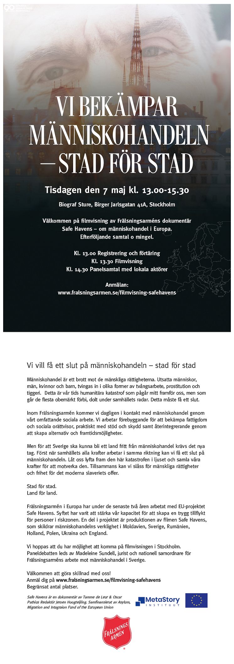 Inbjudan till filmvisning av dokumentären Safe Havens och efterföljande panelsamtal i Stockholm tisdagen den 7 maj 2019.