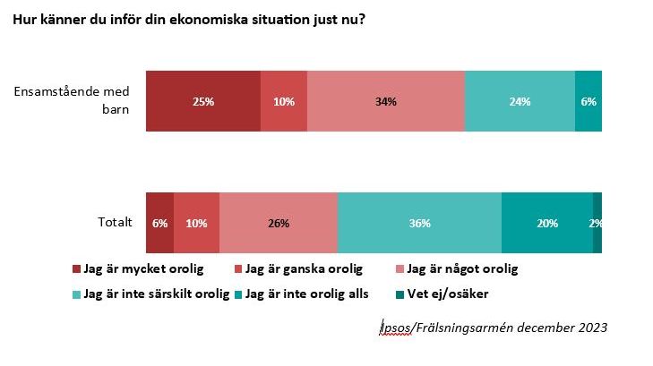 För att ta tempen på situationen bland allmänheten inför jul och nytt år genomförde Frälsningsarmén i december en enkät tillsammans med undersökningsföretaget Ipsos. Svaren visar att 16 procent är ganska eller mycket oroliga för sin ekonomiska situation just nu. En fjärdedel känner sig något oroliga. Enbart 20 procent känner sig inte oroliga alls över sin ekonomiska situation.