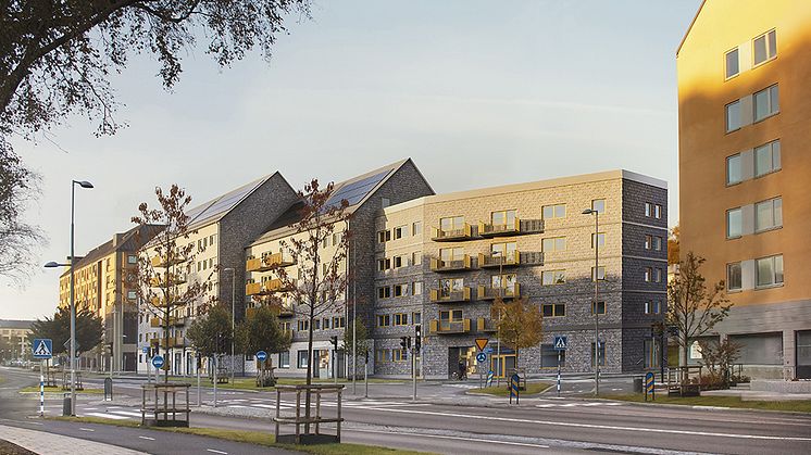 Det blir återbrukat skiffer på fasaden till kvarter Omställningen vid Litteraturgatan i Selma stad. Målet i den unika klimatpiloten är halverad klimatpåverkan från material och byggprocess. För att hålla koldioxidavtrycket på en lägre nivå kläs skiffret på en förnybar trästomme i kombination med takpapp på taket.