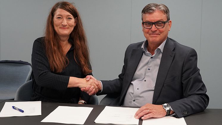 Susanna Gideonsson, ordförande LO, och Leif Linde, ordförande Fremia, undertecknar nytt huvudavtal för omställning.