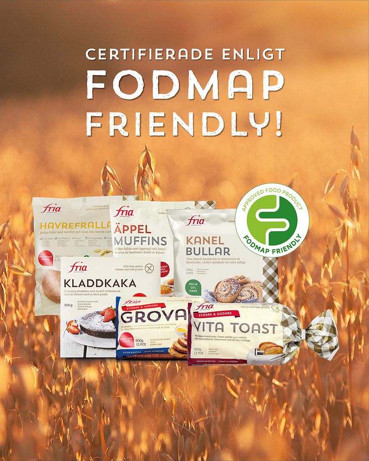 - Det känns roligt att vi nu är säkra på att en stor del av vårt sortiment är låga i FODMAP. Vi har misstänkt det länge och fått många frågor om just IBS och FODMAP från våra konsumenter. Att vi nu fått det säkerställt och i komplement till glutenfritt, laktos- och mjölkfritt även kan erbjuda produkter med låg FODMAP känns väldigt bra, säger Margareta Elding-Pontén, Celiakispecialist Fria Bröd AB.