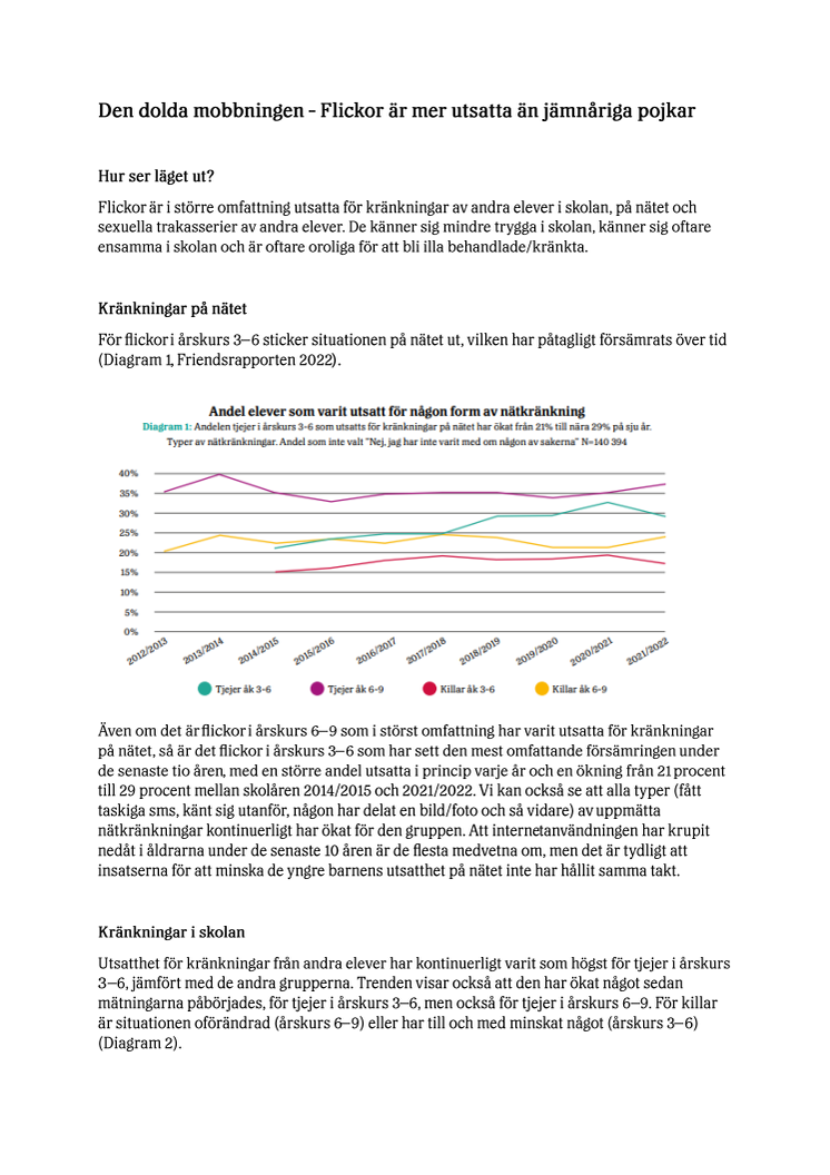 När det gäller nätkränkningar visar Friends 10-årsanalys att det är flickor i årskurs 3–6 som har drabbats av den mest omfattande försämringen under de senaste tio åren, med en större andel utsatta i princip för varje år som gått. Bland elever i åk 6-9 är det fler flickor än pojkar som svarar att de blivit utsatta för sexuella trakasserier.