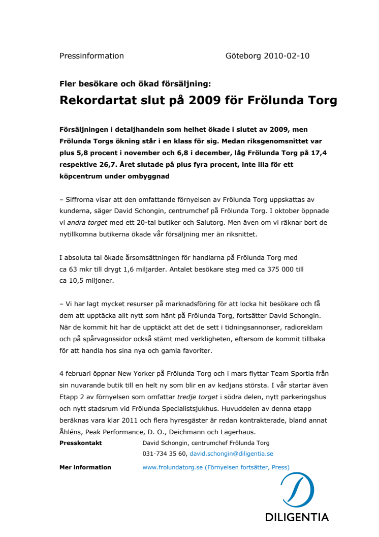 Försäljningen i detaljhandeln som helhet ökade i slutet av 2009, men Frölunda Torgs ökning står i en klass för sig. Medan riksgenomsnittet var plus 5,8 procent i november och 6,8 i december, låg Frölunda Torg på 17,4 respektive 26,7. Året slutade på plus fyra procent, inte illa för ett köpcentrum under ombyggnad