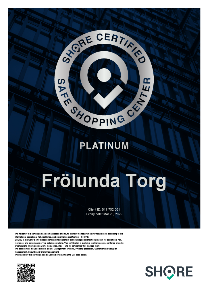 Platinum för Frölunda Torg i internationella säkerhets- och trygghetscertifieringen SHORE