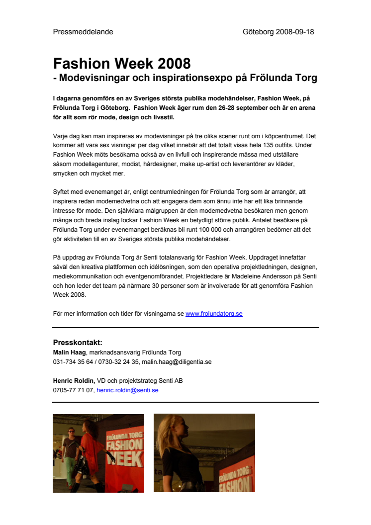 På uppdrag av Frölunda Torg är Senti totalansvarig för Fashion Week. Uppdraget innefattar såväl den kreativa plattformen och idélösningen, som den operativa projektledningen, designen, mediekommunikation och eventgenomförandet. Projektledare är Madeleine Andersson på Senti och hon leder det team på närmare 30 personer som är involverade för att genomföra Fashion Week 2008.