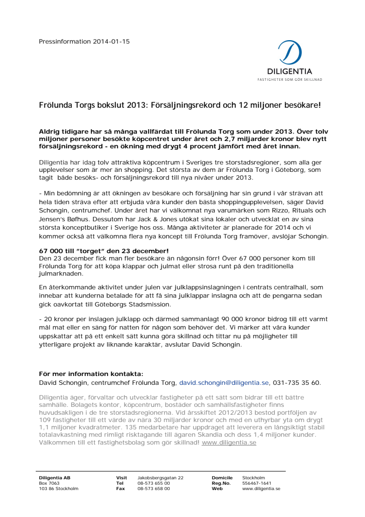 För mer information kontakta:David Schongin, centrumchef Frölunda Torg, david.schongin@diligentia.se, 031-735 35 60.