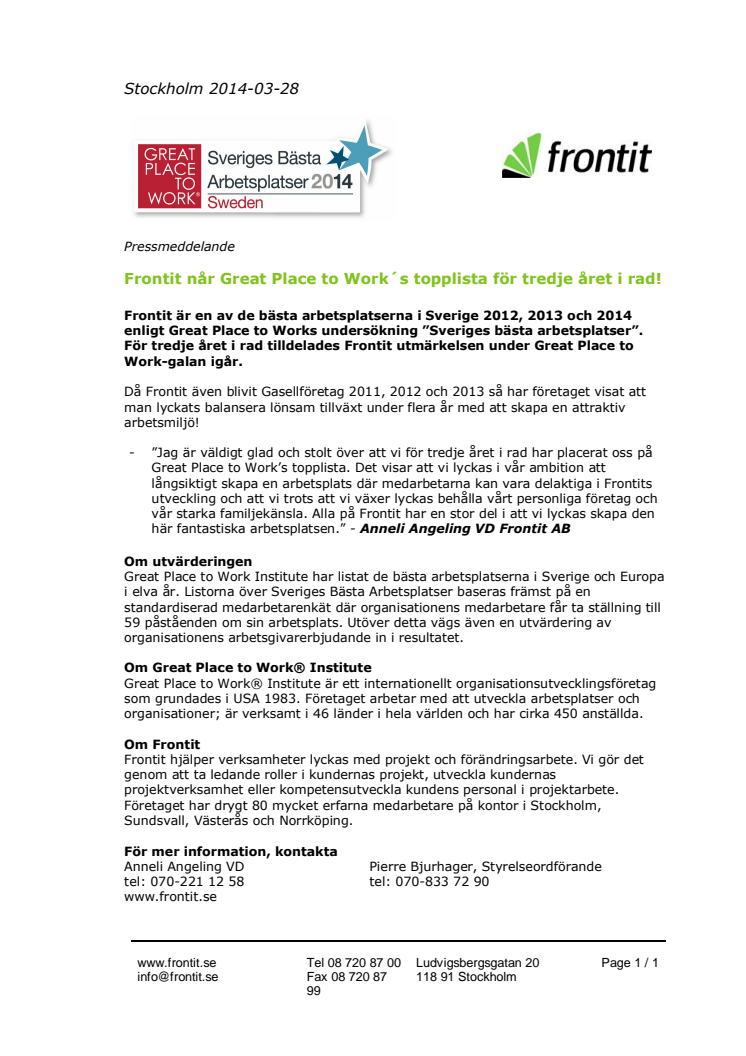 Frontit är en av de bästa arbetsplatserna i Sverige enligt Great Place to Works undersökning ”Sveriges bästa arbetsplatser”. För tredje året i rad tilldelades Frontit utmärkelsen under Great Place to Work-galan igår. Då Frontit även blivit Gasellföretag 2011, 2012 och 2013 så har företaget visat att man lyckats balansera lönsam tillväxt under flera år med att skapa en attraktiv arbetsmiljö!