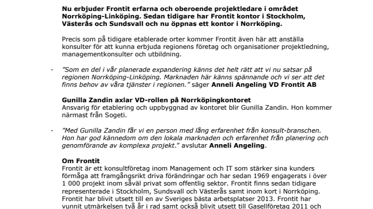 - ”Som en del i vår planerade expandering känns det helt rätt att vi nu satsar på regionen Norrköping-Linköping. Marknaden här känns spännande och vi ser att det finns behov av våra tjänster i regionen.” säger Anneli Angeling VD Frontit AB