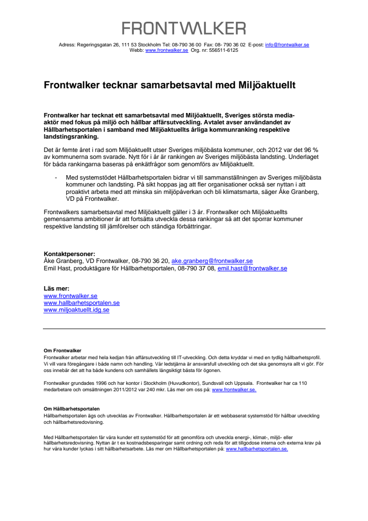 Frontwalker har tecknat ett samarbetsavtal med Miljöaktuellt, Sveriges största mediaaktör med fokus på miljö och hållbar affärsutveckling. Avtalet avser användandet av Hållbarhetsportalen i samband med Miljöaktuellts årliga kommunranking respektive landstingsranking. Frontwalkers samarbetsavtal med Miljöaktuellt gäller i 3 år.