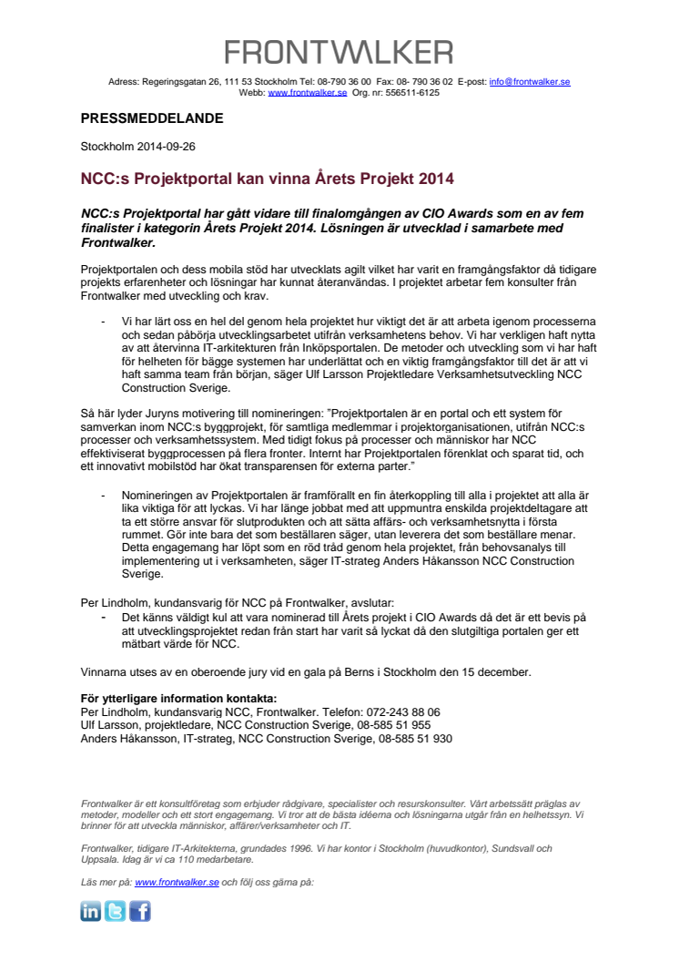 NCC:s Projektportal har gått vidare till finalomgången av CIO Awards som en av fem finalister i kategorin Årets Projekt 2014. Lösningen är utvecklad i samarbete med Frontwalker.