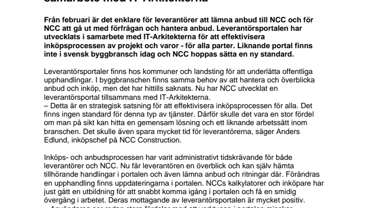 - Vi har lärt oss en hel del genom hela projektet hur viktigt det är att arbeta igenom processerna och sedan påbörja utvecklingsarbetet utifrån verksamhetens behov. Vi har verkligen haft nytta av att återvinna IT-arkitekturen från Inköpsportalen. De metoder och utveckling som vi har haft för helheten för bägge systemen har underlättat och en viktig framgångsfaktor till det är att vi haft samma team från början, säger Ulf Larsson Projektledare Verksamhetsutveckling NCC Construction Sverige.