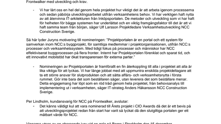 - Det känns väldigt kul att vara nominerad till Årets projekt i CIO Awards då det är ett bevis på att utvecklingsprojektet redan från start har varit så lyckat då den slutgiltiga portalen ger ett mätbart värde för NCC.