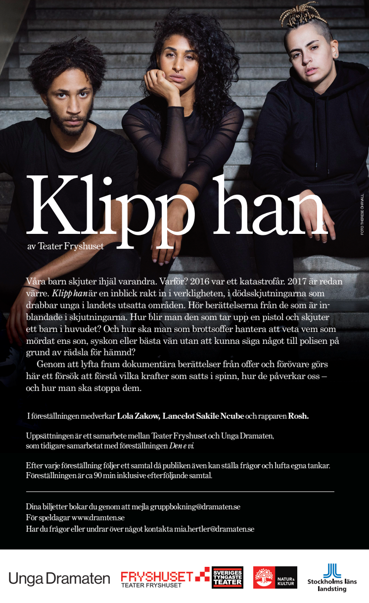 Våra barn skjuter ihjäl varandra. Varför? Klipp han är en inblick rakt in i verkligheten, i dödsskjutningarna som drabbar unga i landets utsatta områden. I föreställningen medverkar Lola Zakow, Lancelot Sakile Ncube och rapparen Rosh. Uppsättningen är ett samarbete mellan Teater Fryshuset och Unga Dramaten. Efter varje föreställning följer ett samtal med publiken.