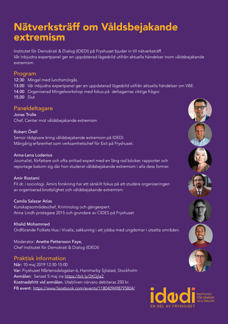 Välkommen till en nätverksträff om våldsbejakande extremism den 10 maj på Fryshuset i Stockholm. arrangerad av Institutet för Demokrati & Dialog (IDEDI). En expertpanel ger en uppdaterad lägesbild utifrån aktuella händelser inom våldsbejakande extremism.