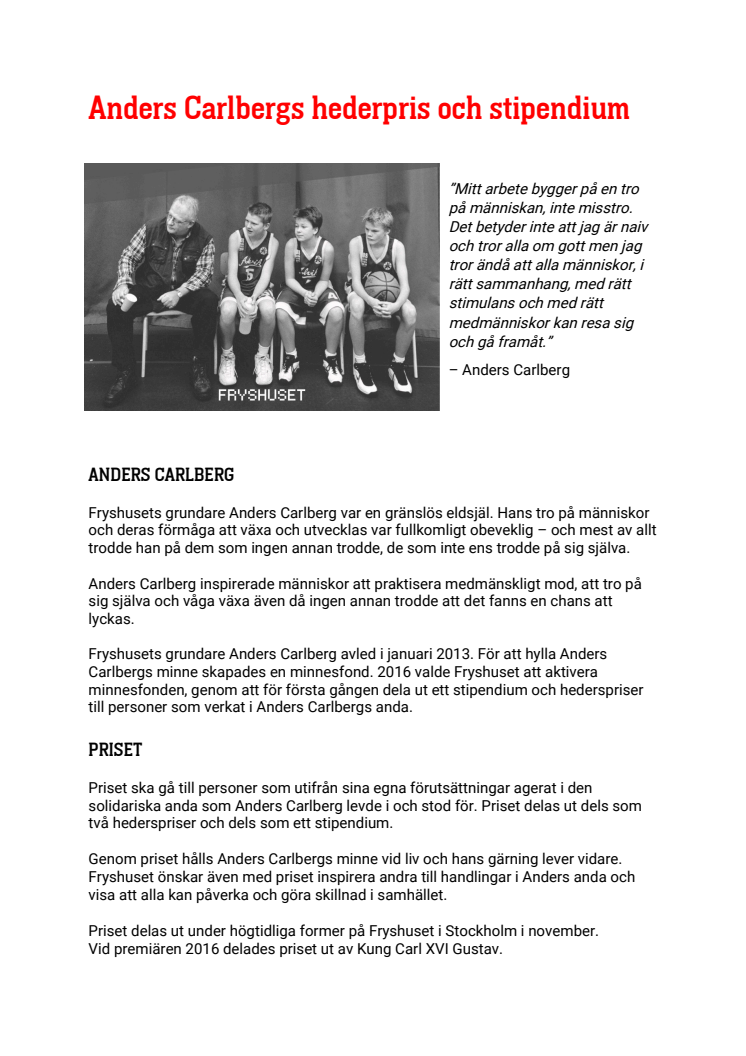 Fryshusets grundare Anders Carlberg inspirerade människor att praktisera medmänskligt mod, att tro på sig själva och våga växa även då ingen annan trodde att det fanns en chans att lyckas. Anders Carlberg avled i januari 2013. För att hylla hans minne skapades en minnesfond som aktiverades 2016, då för första gången hederspriser och ett stipendium delades ut till personer som verkat i Anders Carlbergs anda.