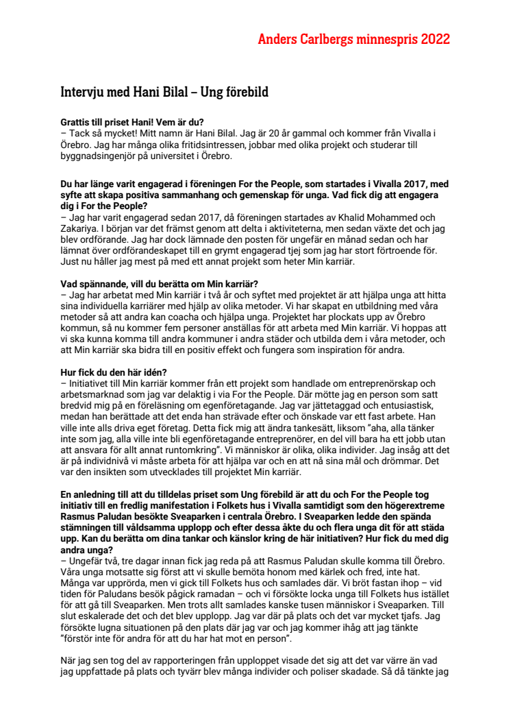 – Jag vill göra väldigt mycket i framtiden, men det jag vill mest nu är att sprida mitt koncept med Min karriär och utbilda andra kommuner i hur de kan jobba för att hjälpa unga. Sedan vill jag också bli klar med min egen utbildning och bygga upp mitt bolag. Och så vill jag fortsätta hjälpa människor! Anders Carlbergs minnespris ger en drivkraft till det jag gör. Nu vill jag jobba mycket, mycket mer! Avslutar Hani.