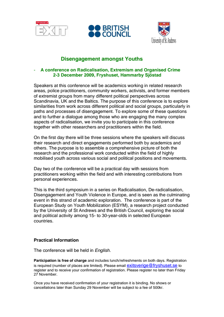 Konferensen är den tredje i en serie om radikalisering, avradikalisering, och ungdomsvåld i Europa och är en del av European Study on Youth Mobilization (ESYM), ett europeiskt forskningsprojekt som genomförs av University of St Andrews och British Council.