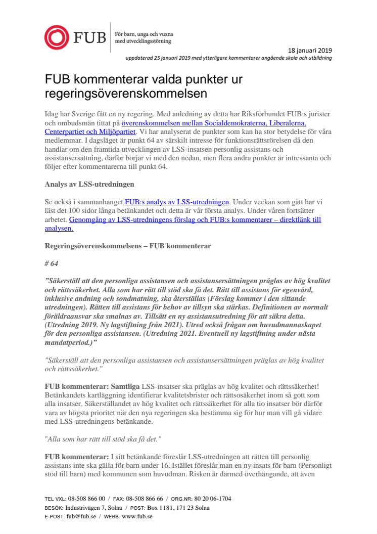 Riksförbundet FUB:s jurister och ombudsmäns analys av regeringsöverenskommelsen från januari 2019. Dokumentet inleds med den särskilt viktiga punkten 64 om LSS-insatsen personlig assistans och assistansersättning. Därefter övriga utvalda punkter samt kommentarer.