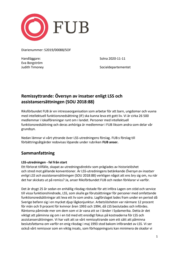 FUB:s remissyttrande LSS-utredningen 2020 Översyn av insatser enligt LSS och assistansersättningen (SOU 2018:88)